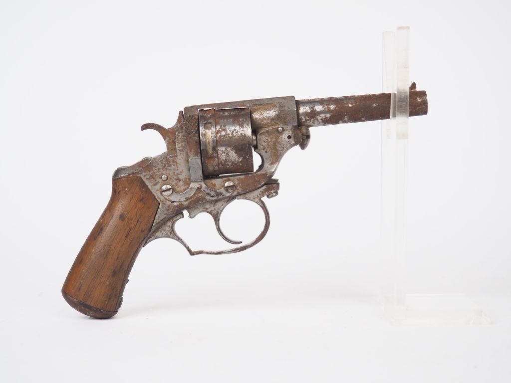 Revolver à système Perrin calibre 9 mm dit "baby Perrin". Arme en simple et double action, numéro 3618. cadre fermé, arme poli blanc avec quelques attaques superficielles d'oxydation sans gravité.trés bon canon, signature sur le canon en gothique "Perrin bté à Paris" rappel de détente un peu faible à cause de la sécheresse excessive du mécanisme. Arme de catégorie "D". (Etat 2+)