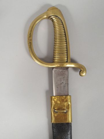 Sabre briquet modèle AN XI, fusée en bronze coulé à 28 torons, signée « Versailles » sur l’arc de jointure, quillon en goutte d’eau, lame plate de 595mm de long signée au dos « Manufacture Impériale du Klingenthal Couleaux frères ». Dans son fourreau en cuir noir à deux garnitures laiton, chape à pontet. (1-).