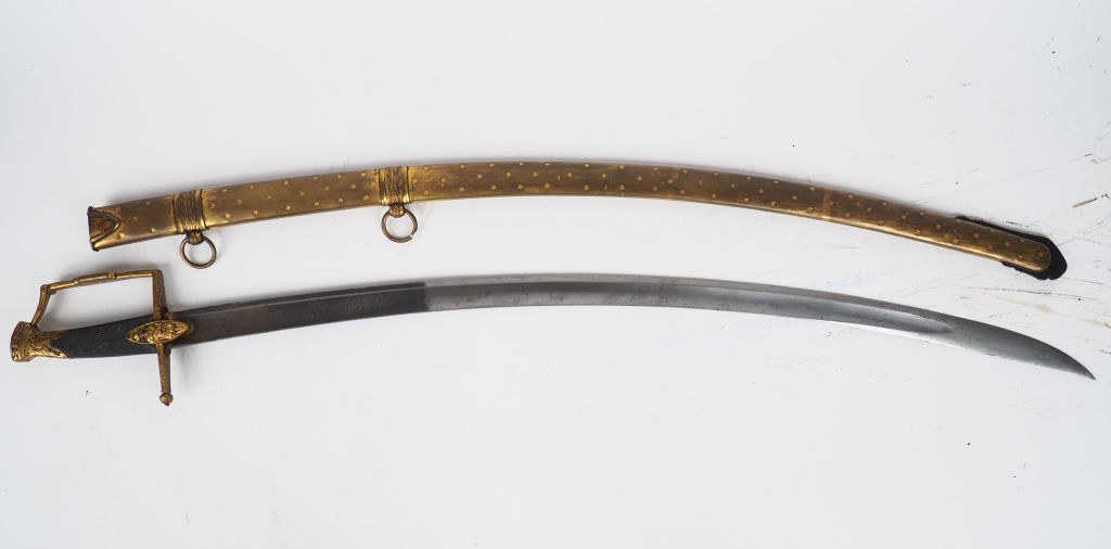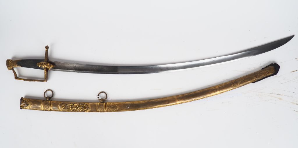 Sabre composite dans le goût d’un sabre de luxe d’officier de cavalerie légère époque Consulat, monture en bronze doré, calotte à courte queue couronnée d’une guirlande de feuillage au plateau de pommeau incliné vers la branche de garde, un brin arqué joint la branche de garde principale élargie en son centre par la présence d’un médaillon au motif central à la fleur d’héliotrope, face avant de la branche striée de part et d’autre du médaillon, la dite branche de garde joint à angle droit la croisière de garde, importants oreillons allongés à décor de casque et de cuirasse, fusée en ébène quadrillé sur les flancs. Lame courbe à gorge et à décor gravé traditionnel, fourreau moderne en laiton face avant enrichie d’un cartouche ovale en relief au trophée d’arme, bracelets plats et larges, décor repoussé d’une urne, dard en acier, le dos du fourreau est décoré d’un semi d’étoiles embouties, décor que l’on retrouve trop souvent à mon goût sur certains sabres de cette collection, l’emploi de ce décor trahissant la même main qui à présidé à la réalisation de ces fourreaux dans l’esprit des armes de luxe. Etat 1-. Belle évocation composite sur lame ancienne montage du 20ème siècle.