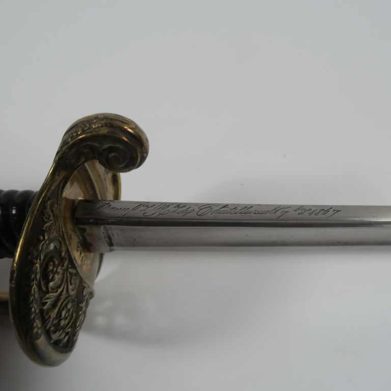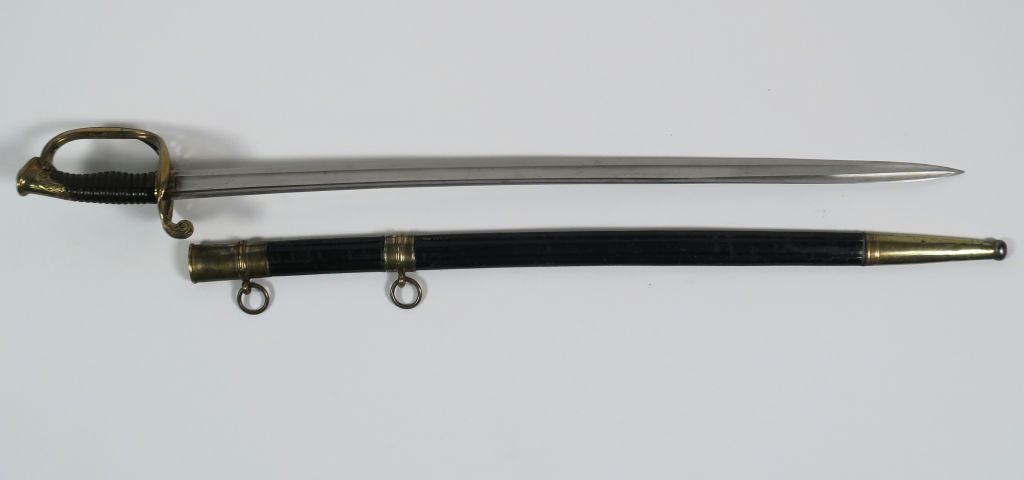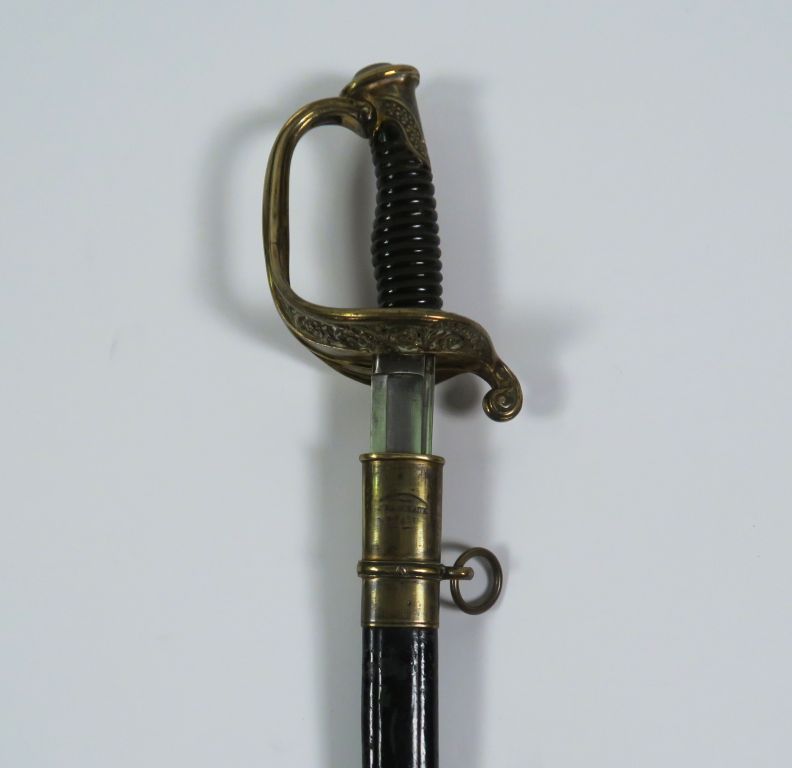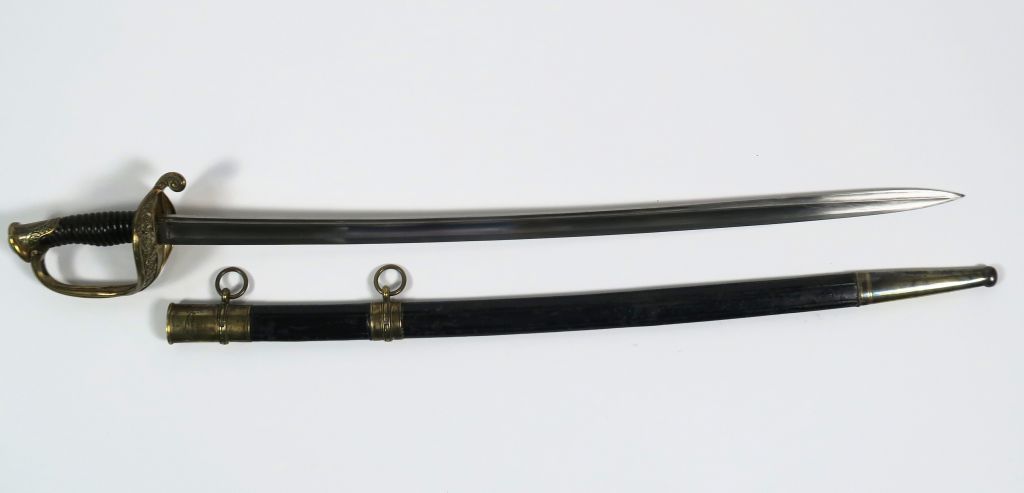 Sabre d’adjudant d’infanterie modèle 1845. Lame courbe à gorge et gouttière et dos arrondi marquage en cursive « Manufacture nationale de Châtellerault 7bre 1847 ». Monture en bronze fondu ciselé, branche de garde unique joignant le plateau par une branche secondaire formant la lèvre d’un plateau ajouré à décor de volutes florales. Fusée corne avec attente de filigrane. Dans son fourreau en cuir vernis noir à trois garnitures (chape à bracelet vissé et anneau, bracelet et bouterolle. La chape porte la signature du fourbisseur « Manceaux à Paris » (Etat 1).
