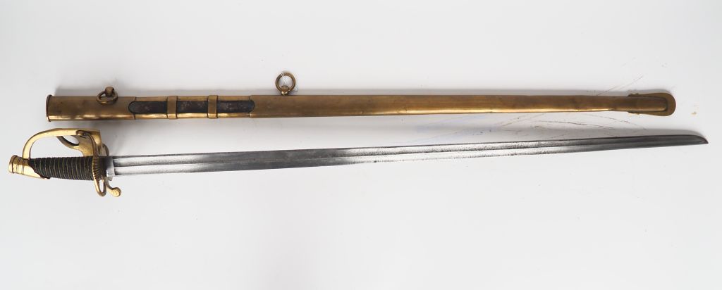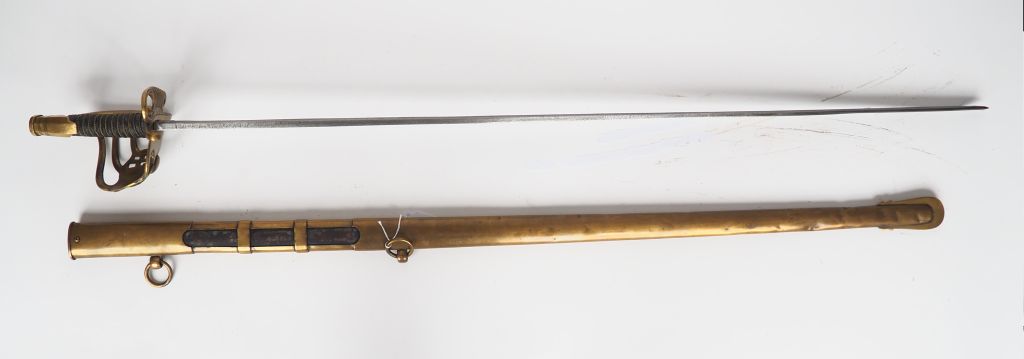 Sabre dans le goût des sabres tel que portés par les officiers des grenadiers à cheval de la garde impériale. Belle monture en bronze fondu à garde de bataille avec pièce de garde en palmette ajourée ornée d’une belle grenade en relief, calotte à courte queue à pans, branche de garde principale se dédoublant en deux branches de garde secondaires joignant la coquille en « S » coquille en palmette ajourée et ornée en relief d’une grosse grenade enflammée rapportée, fusée en bois habillé de chagrin noir et filigranée d’une simple torsade. Belle lame ancienne droite à deux gorges et dos plat venue du Klingenthal (Signature M fture Imp le du Klingenthal). Fourreau entièrement laiton y compris le dard à longue crevée cuir barrée de 2 bagues laiton, deux pitons sondés, anneaux laiton. Composite sur éléments anciens. (Etat 1.