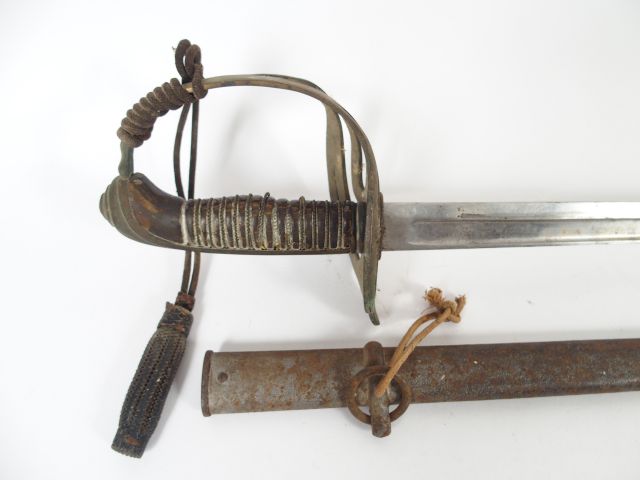 Sabre de fantaisie Français 3eme république, lame plate symétrique à dos plat et à gorge, monture bronze plate à branches multiples et calotte à longue queue. Fusée en corne sombre filigranée, fourreau tôle d’acier à un bracelet mobile, avec dragonne. 2+
