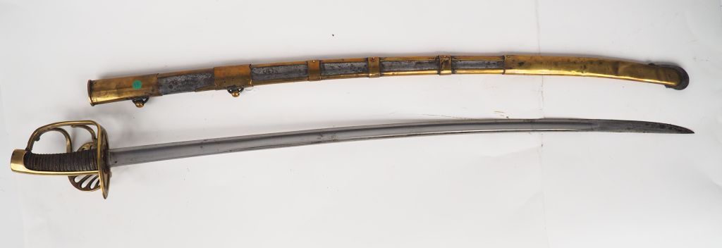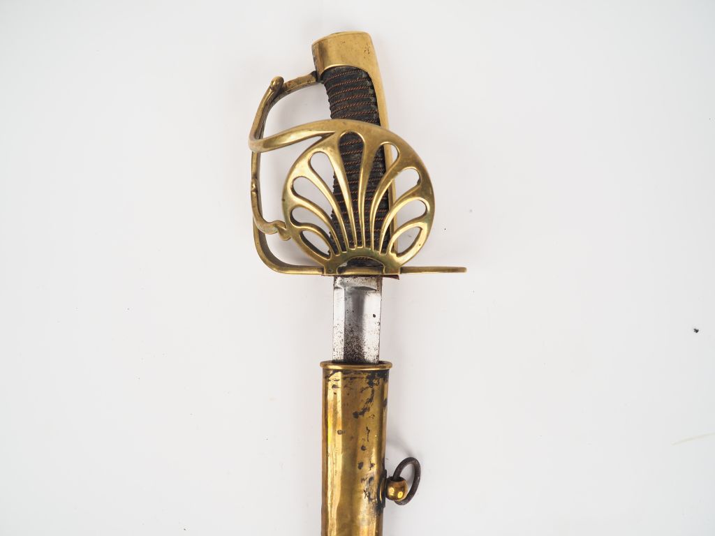 Sabre de la maréchaussée de France au règlement de 1783 (Référence Michel Petard tome 1er Des sabres et des épées page 110 référence 105 R). Monture en bronze fondu calotte ovale à courte queue et bouton de rivure rond et proéminent, courte coquille en coquille st Jacques encadrée d’une accolade et renforcée de deux branches secondaires partant de la branche de garde principale. Fusée entièrement filigranée. Lame plate à pointe dans l’axe vierge de marquage dans son fourreau en cuir à garnitures laiton, chape et bracelets à découpe en accolade portant pitons laiton soudé et anneaux (différent du fourreau décrit par M Pétard). (Etat 1)