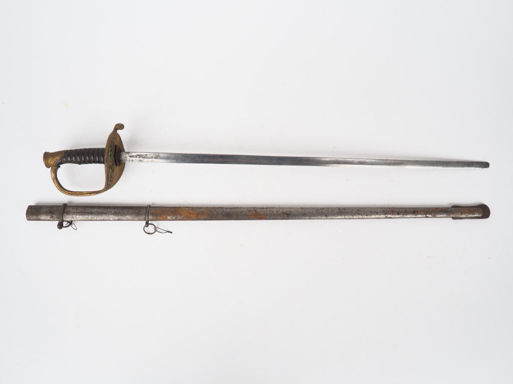 Sabre d’enfant longueur 745 mm imitant un sabre modèle 1845 d’adjudant. Lame décorée à l’eau forte, pointe mouchée, monture en bronze doré et ciselé, dans son fourreau en tôle d’acier à deux bracelets. Etat 2.