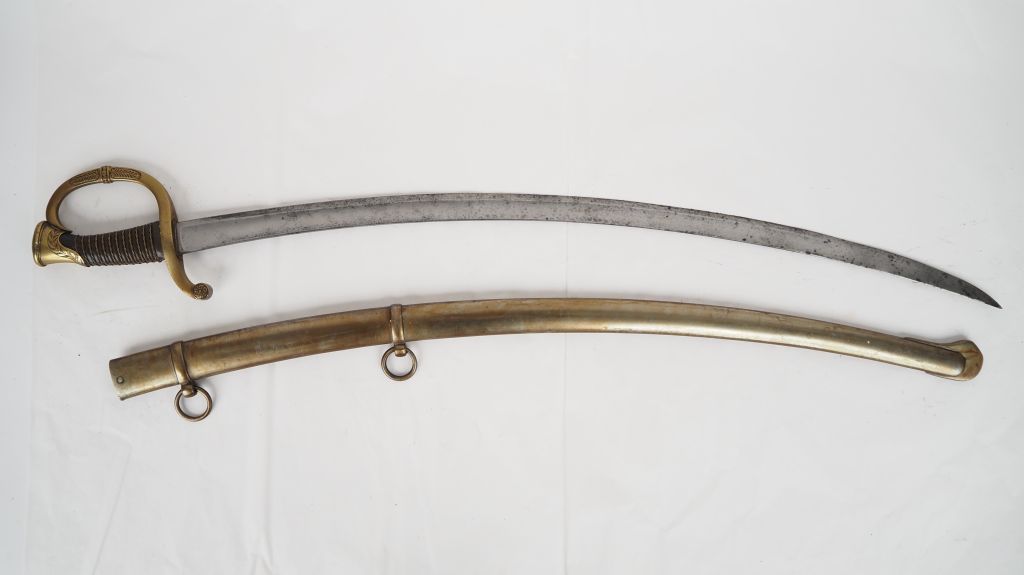 Sabre d’officier de canonnier monté modèle 1829. Poignée (remontée) en corne avec filigrane en laiton postérieur. Monture en laiton, garde à une branche, à décor de lauriers et palmettes. Lame courbe à dos plat gravé « Coulaux Ainé Cie Klingenthal » Fourreau en tôle de fer à deux bracelets. Longueur : 98 cm. A.B.E. (verni).