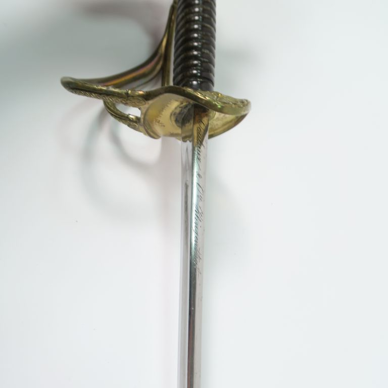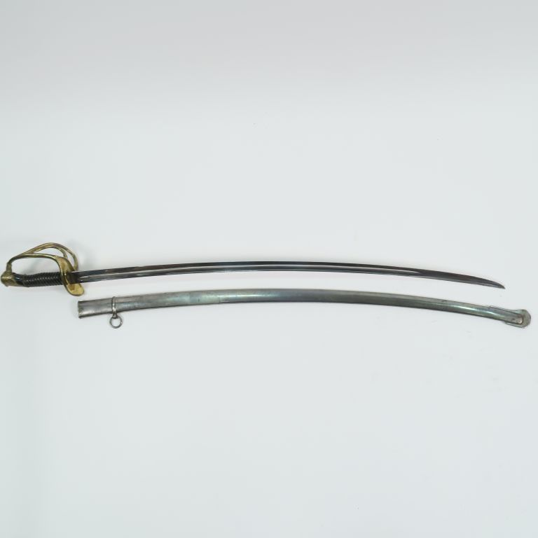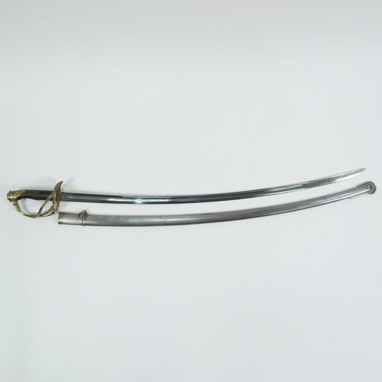 Sabre d’officier de cavalerie type 1822 d’achat privé. Monture en bronze doré ciselé, branche de garde unique joignant le plateau et se dédoublant en deux branches secondaires en « S », calotte à courte queue, fusée corne sombre, filigrane cassé. Lame courbe à gorge et dos bombé, signature en cursive « Couleaux et cie Klingenthal ». (Etat 1-)