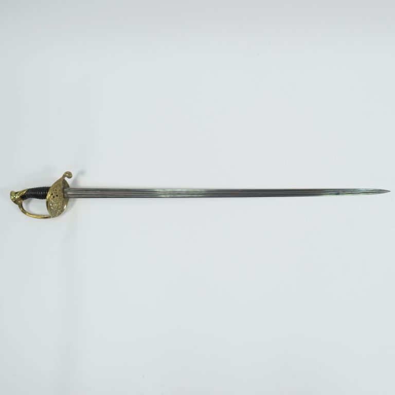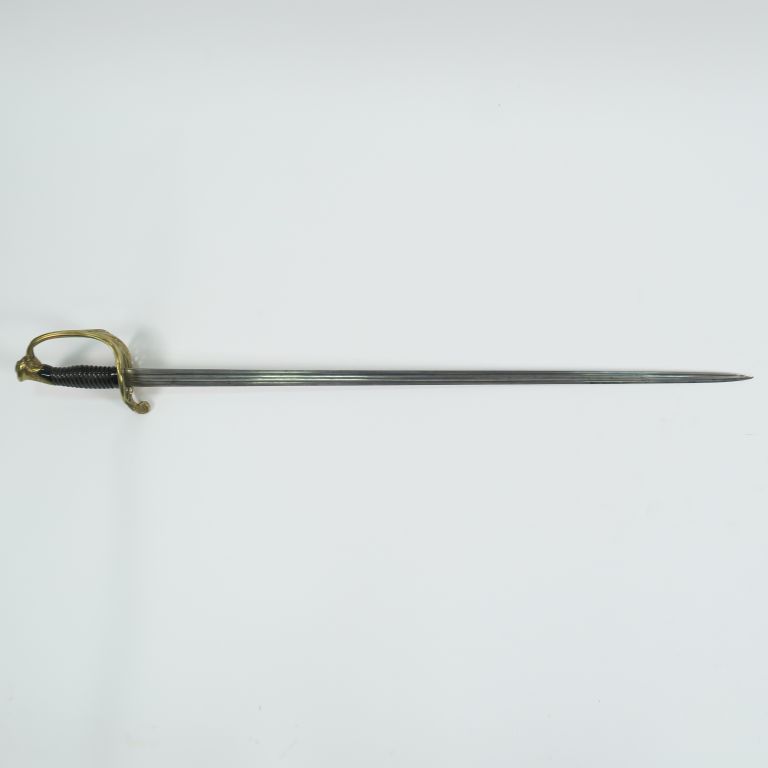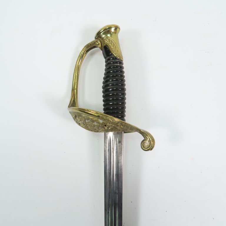Sabre d’officier supérieur d’infanterie modèle 1855, lame droite symétrique de section lenticulaire à deus fines gorges droites et pointe dans l’axe de la lame. Monture en bronze doré ciselé, plateau découpé à jour à décor de volutes de feuillage .Calotte à courte queue, branche de garde unique, quillon arque vers l’avant à terminaison en crosse de fougère. Fusée en corne sombre avec attente de filigrane, pas de fourreau. (Etat 1)