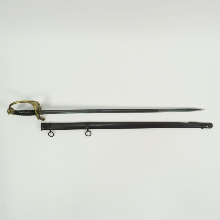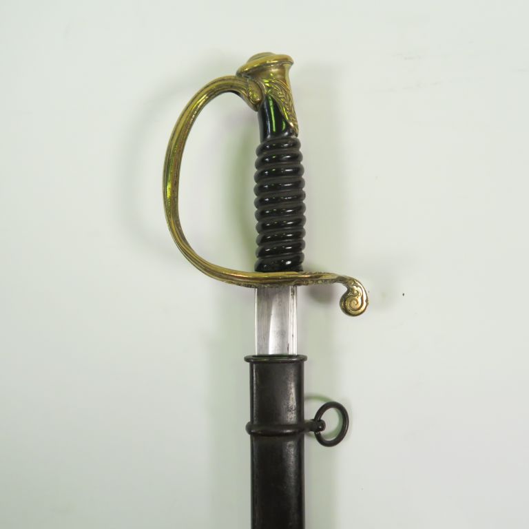 Sabre modèle 1845 d’adjudant, monture en bronze fondu ciselé, calotte à courte queue, plateau découpé à jour avec volutes de feuillage. Quillon arque vers l’avant, fusée bois noir filigrane absent. Lame droite à gorge et fine gouttière, dos plat, long contre tranchant. Signature au dos de la lame «Châtellerault 1870». Fourreau noirci en tôle d’acier à deux bracelet.(Etat 2+)