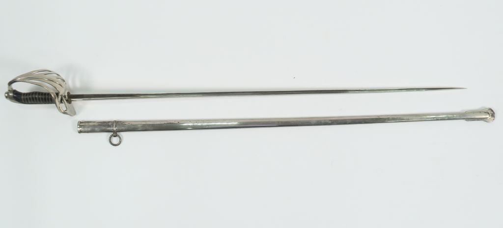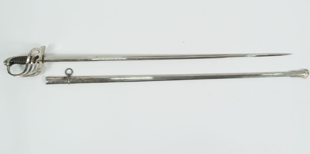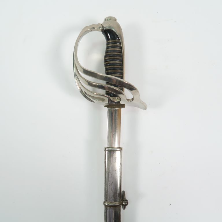 Sabre modèle 1882 d’officier d’infanterie, arme montée maillechort, fusée corne filigranée, lame de section lenticulaire à deux fines gouttières décalées, pas de marquage, dans son fourreau en tôle d’acier nickelé à un bracelet. Dans son protège fourreau en toile brune habillé de suédine crème avec fermeture type porte-monnaie. (Etat 1).