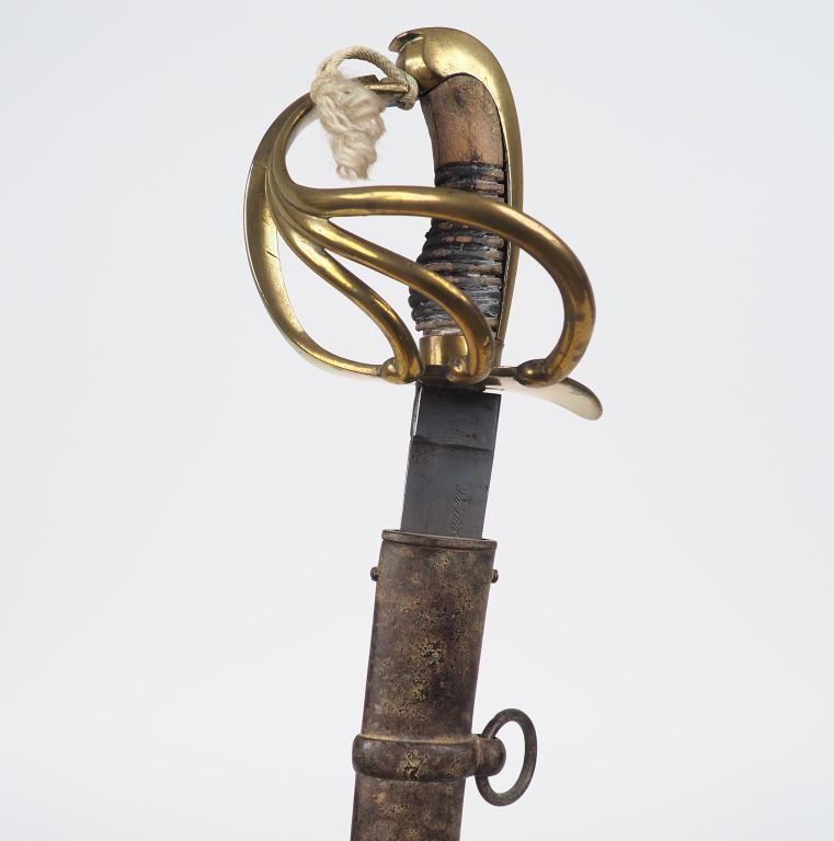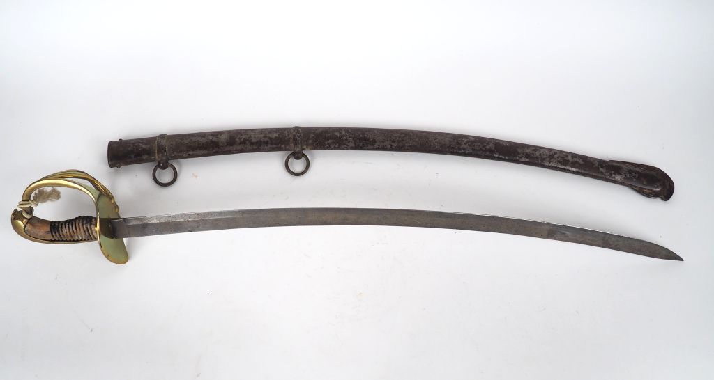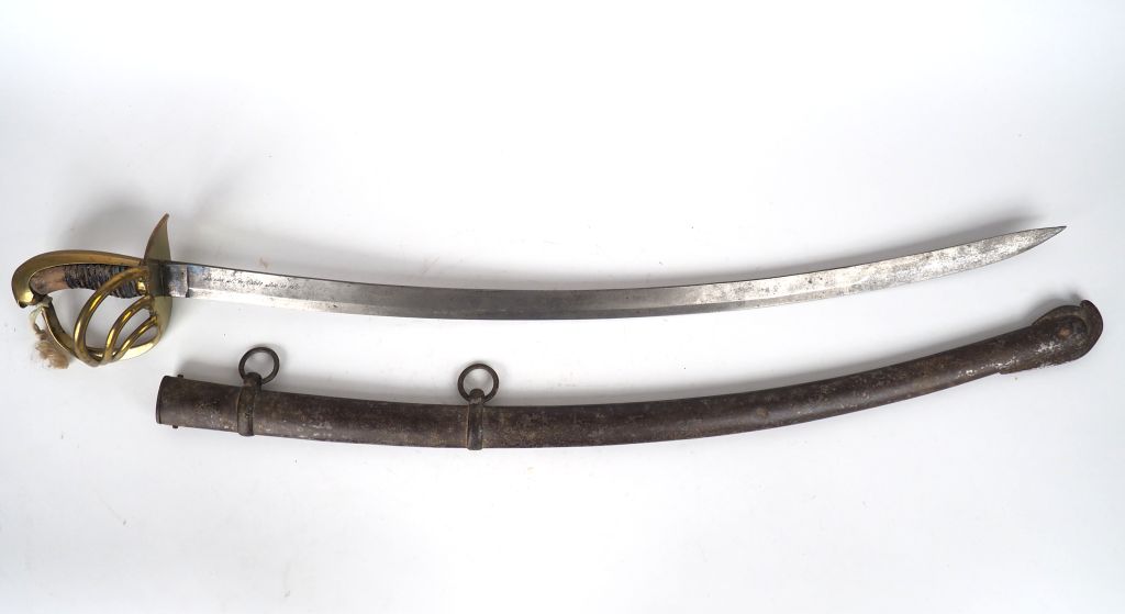 Sabre troupe de cavalerie espagnole – lame courbe à dos plat signée sur le flanc droit en cursives « Fabrica de Toledo ano 1839 » - Monture en bronze fondue multibranche joignat un plateau symétrique calotte à longue queue fusée bois filigrane et chagrin absents – dabs son fourreau en tôle d’acier à bracelets mobiles. Etat 2-.