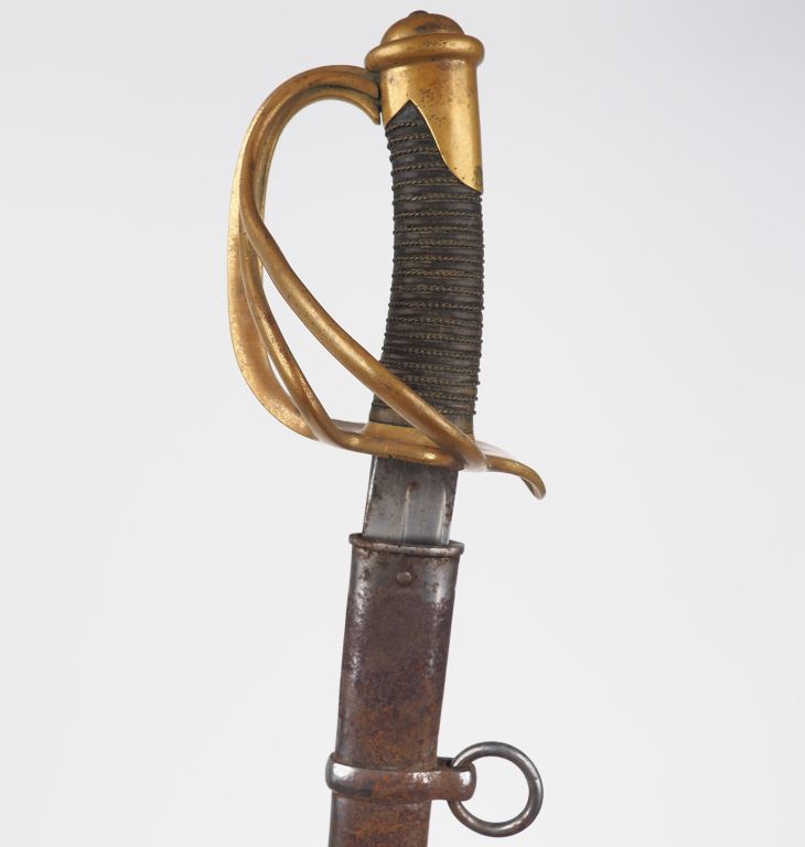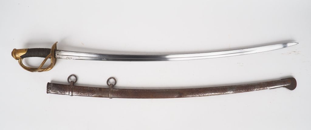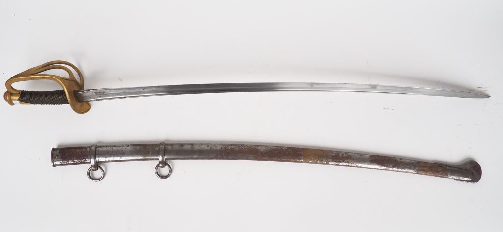 Sabre troupe de cavalerie légère, lame courbe à dos plat gravée Manufacture d’armes de Châtellerault Mars 1880, monture en bronze fondu multibranche, calotte à courte queue, fusée bois habillée de chagrin et filigranée, dans son fourreau en tôle d’acier à 2 bracelets. Etat 1-.