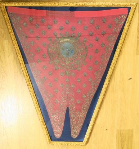 Superbe guidon de cavalerie en soie du Régiment de Dragons d’Orléans (7eme). Guidon biface en soie rouge sur l’avers, semi de fleur de lys en cannetille d’argent en relief, belle broderie entourant le guidon au motif de volutes dans le style employé lors du règne du roi soleil. Le médaillon central est brodé en cannetille dorés, une couronne royale surmonte l’ensemble, un collier du St Esprit entoure le cartouche rond central qui sur fond bleu porte trois fleurs de lys. La ganse de passage de la hampe à été restaurée avec une soie d’un rouge différent, on trouve aussi des traces de coutures anciennes semblant indiquer que ce guidon a un jour flotté sur sa hampe. Contrairement à la documentation que l’on peut trouver sur les guidons du 7eme de Dragons sous l’ancien régime, les pointes de ce guidon ne portent pas les initiales que l’on s’attendrait à y trouver, cependant une certaine fantaisie pouvait régner dans ce genre de commande. L’Avers en soie jaune reprend simplement le semi de fleurs de lys argent et la bordure brodée. Les fils de la canetille sont constitués d’un fil de soie et d’un fin fil argenté ou doré entourant le fil constituant l’âme (technique de la broderie d’application). L’ensemble est présenté dans un cadre vitré. Fabrication manuelle ancienne, le tissu est d’un tissage employé au 18eme siècle, très bel objet puissamment évocateur de l’épopée des régiments de cavalerie de l’ancien régime, (Ce régiment ayant été crée en 1718 et licencié en 1815). Expert : Gilles Sigro : hautcomminges@orange.fr
