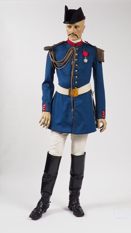 Superbe mannequin d’un officier (capitaine) des cuirassiers de la Garde Second Empire, tunique en fin drap bleu céleste à doublure rouge (1863/1865), collet droit et parement de manche rouge garance. Boutons bombés argent à l’aigle impériale couronnée et marqués « Garde impériale ». Aiguillettes argent à deux ferrets à décor d’aigle non couronnée, large ceinturon (65 mm) en buffleterie blanche avec sa sangle porte sabre, piqure et bourrelet typique de la Garde sur le cuir, plateau rectangulaire en laiton à pans coupés, et à la grenade enflammée (80 x 100 mm). Pantalon en drap blanc, bottes à l’écuyère fabrication « Au sabot rouge » en cuir noir à haute tige et bout carré avec éperons indépendants laiton à molette fer. Bicorne en taupé noir à ganse noire également, galon plat argent en passementerie de canetille, bouton bombé argent à l’aigle couronnée et marquage « Garde impériale ». Cocarde tricolore plissée, deux floches argent captives aux pointes de la coiffure, intérieur garni de soie brune, bandeau anti transpirant en fin cuir fauve, marquage au fond de la bombe, doré au petit fer, « Magnien 273 rue st Honoré Paris », la tunique arbore une croix de chevalier de la Légion d’honneur Second Empire. Cette tunique est marquée sur la doublure à l’encre noir « Dieudonné » (on retrouve un Louis Christian Isidore Dieudonné sous-Lieutenant le 4 Juin 1848 au 2eme de carabiniers élevé au grade de Lieutenant le 11 Mars 1854 dans le même régiment, capitaine le 30 Octobre 1856 et capitaine-commandant en 1862. Affecté en 1863 au 2ème Cuirassiers de la Garde. Retiré en 1867, chevalier de la légion d’honneur, titulaire de la médaille d’Italie). Etat1