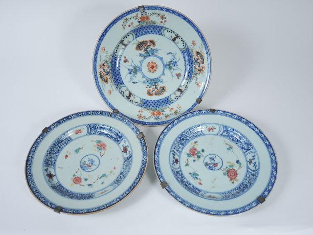 Lot de 3 assiettes en porcelaine bleu-blanc et porcelaine de la famille rose, à décor de Lingzhi. Chine, Compagnie des Indes, période Qianlong, XVIIIe siècle. Diam. : 22.5 cm et 24.5 cm (éclat au revers d’une assiette, sauts d’émail). Expert : cabinet ANSAS