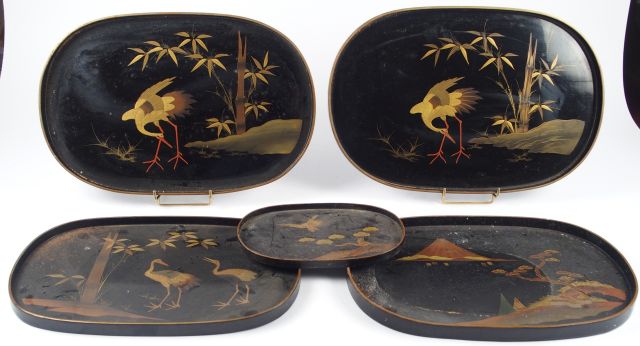 5 plateaux en laque à décor d'échassier et de paysage du Mont Fuji