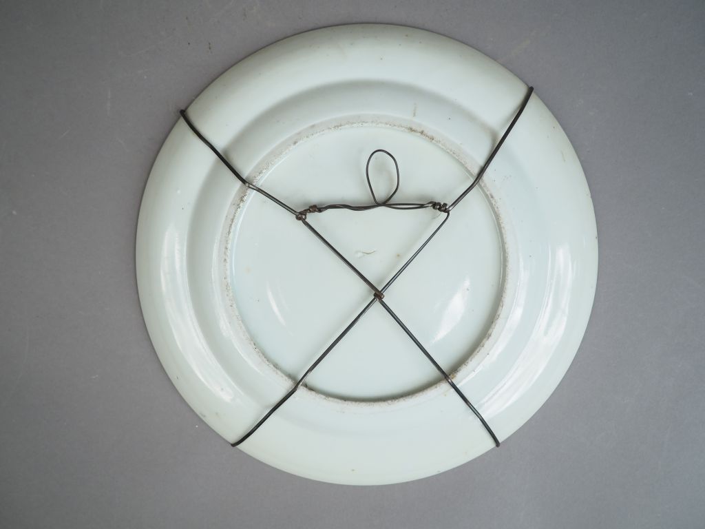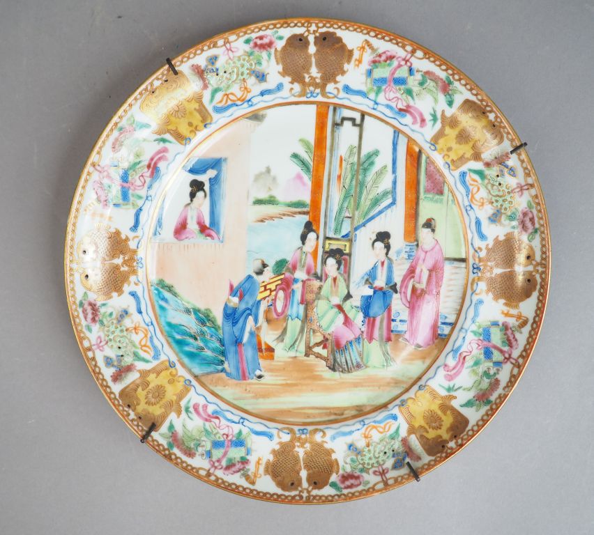 Assiette en porcelaine et émaux polychrome, à décor en plein de personnages, marli rehaussé d'or à décor de poissons et de trophées. Chine, fin XVIIIème - début XIXème. Diam. 25,3 cm