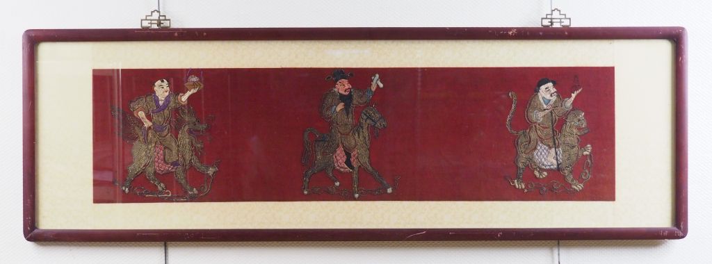 Bandeau (en trois panneaux) en satin de soie et lin brodé représentant la divinité Zhoulao sur un échassier entouré des huit immortels. Chine, période Guangxu, fin du XIXème siècle. Dim. de chaque panneau : 34,5 x 135,5 cm