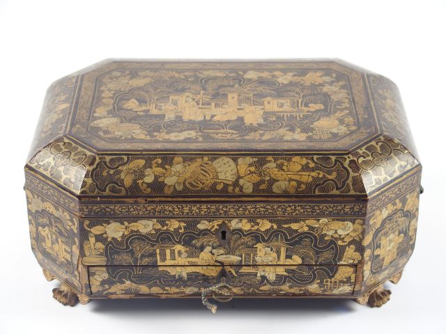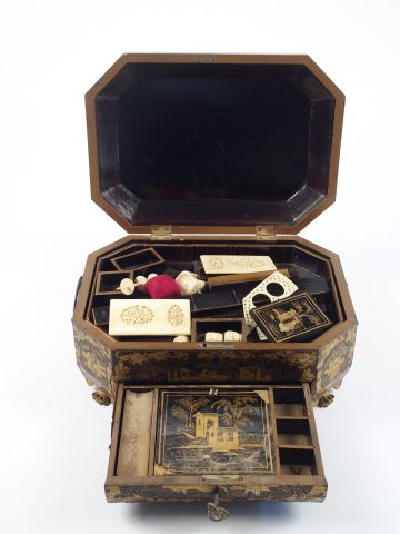 Boite à coûture en laque de Canton, à décor de terrasses animées de personnages sur fond noir. Vers 1880 (manques et accidents, sauts de laque)