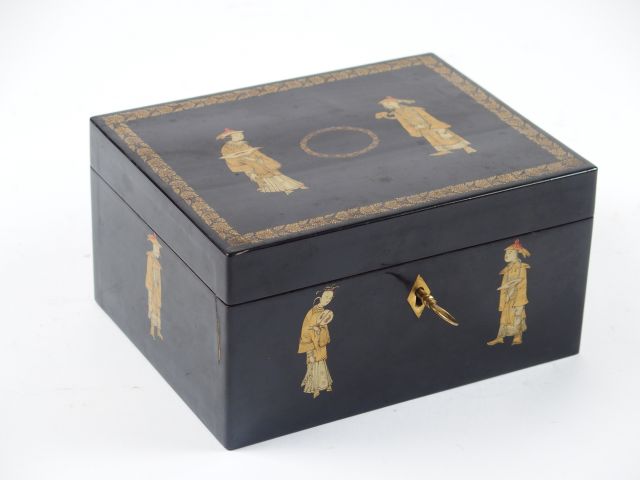 Boite à thé en laque de Canton, à décor laqué or sur fond noir de dignitaires , contient deux flacons en étain. Chine vers 1880/1900 (petites rayures)