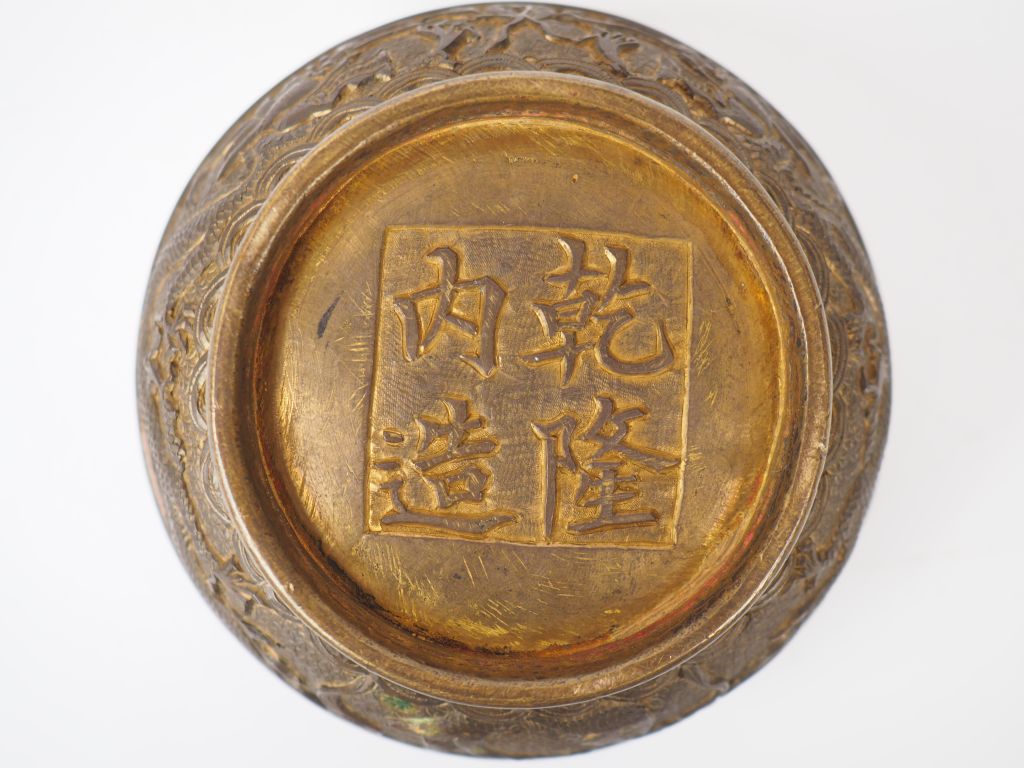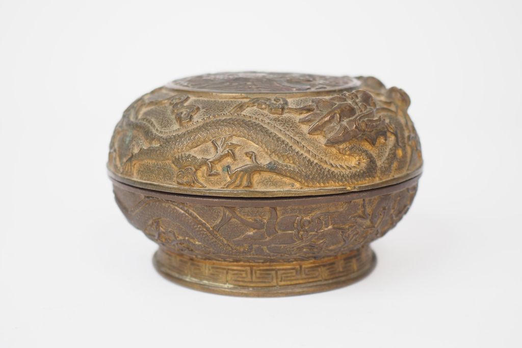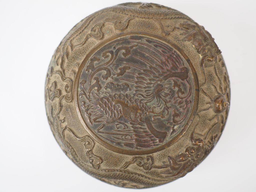 Boite couverte en bronze, à décor ciselé de dragon poursuivant la perle sacrée et d'un phonéix. Marque apocryphe Qianlong sur la base. Chine, vers 1900. Diam. 10 cm