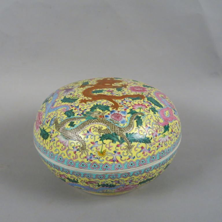 Boite couverte en porcelaine et émaux de la famille rose, décor sur fond jaune de dragons parmi des pivoines, clématites et lotus. Marque apocryphe Qianlong sur la base. Chine, Xxème siècle. Diam. 28 cm