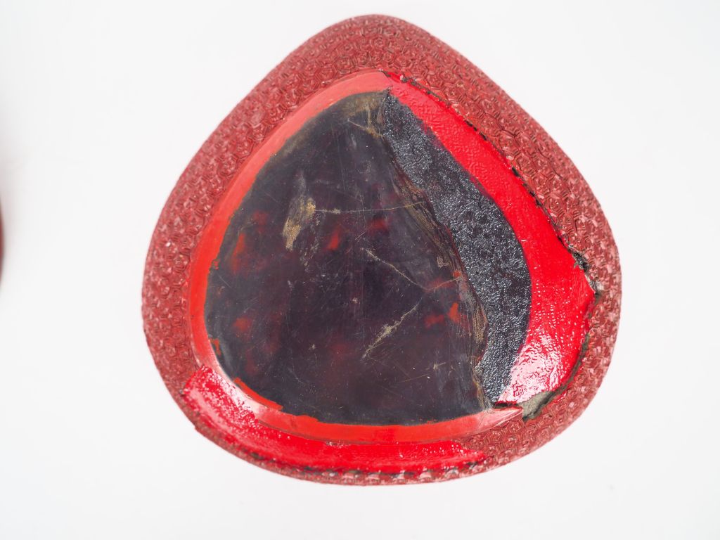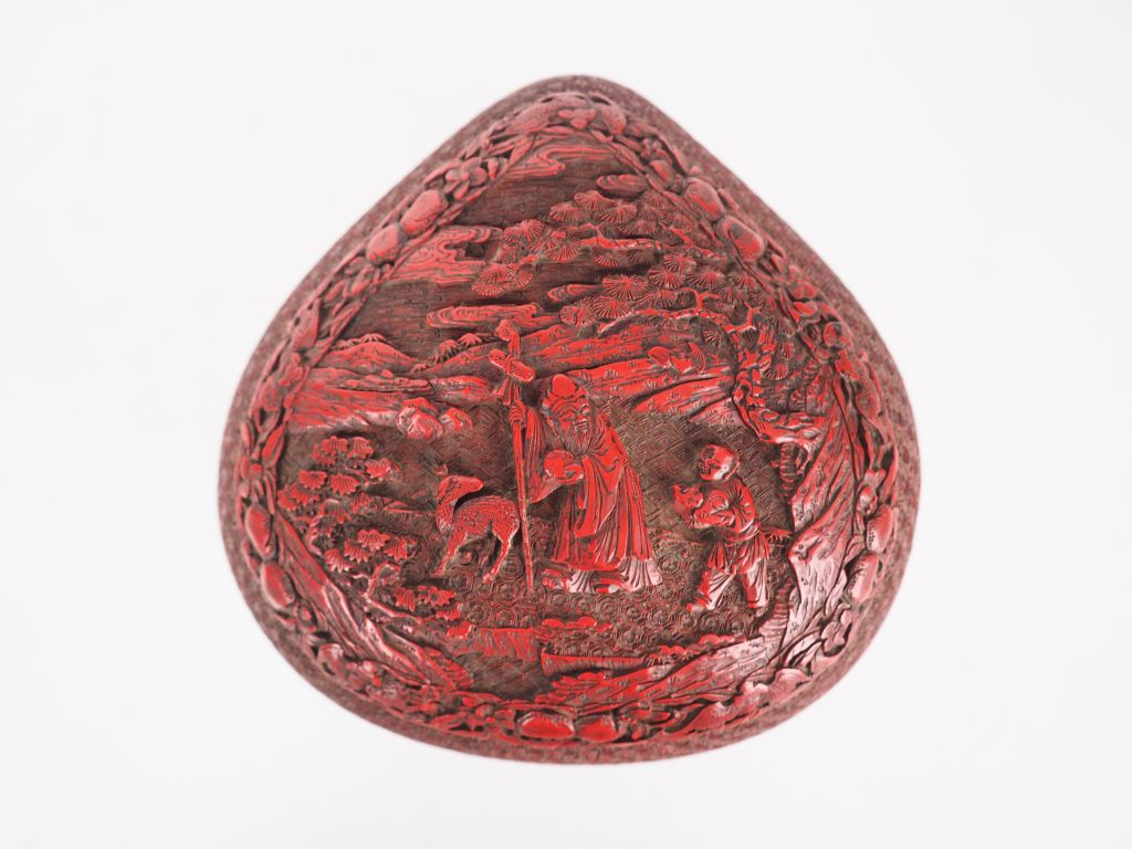 Boite couverte reprenant la forme d'une pêche de longévité en laque de Cinabre sculptée d'un sage accompagné de son disciple. Chine XVIIIème L. 16 cm (manque et accidents)