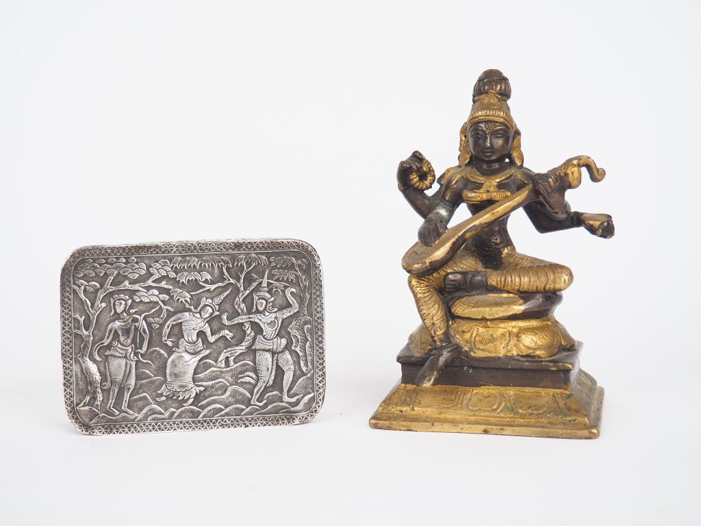 Boite en argent repoussé Siam et une statuette "musicienne" Inde Largeur 8,5 cm