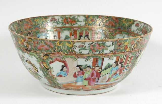 Bol à punch en porcelaine de Canton, à décor de scènes de palais, fleurs, oiseaux et végétaux. Période Guanxu. Diam. : 29,5 cm