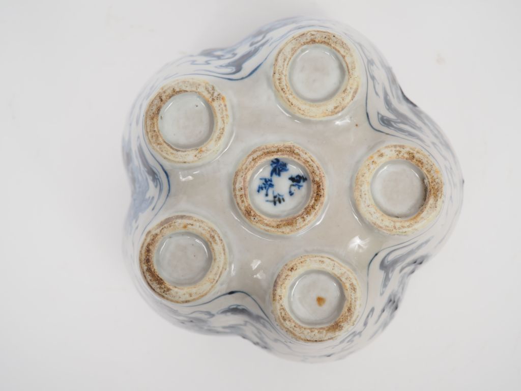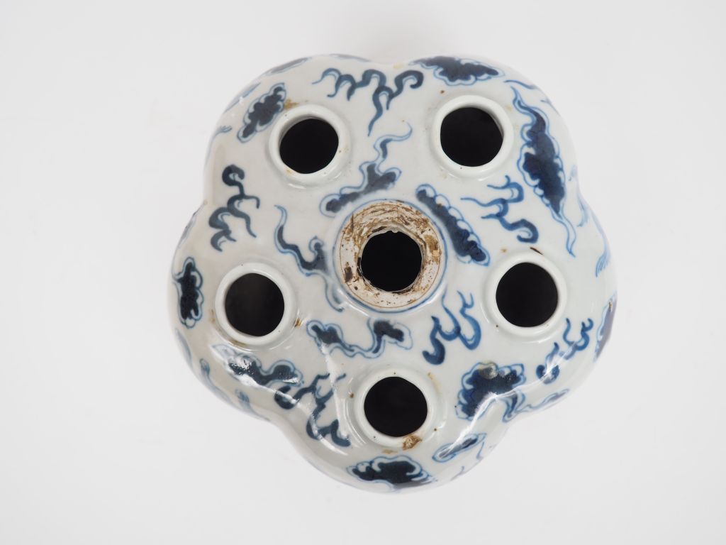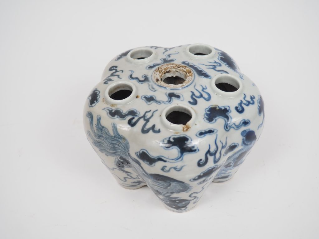 Bouquetière en porcelaine bleu blanc, à décor de lion bouddique évoluant parmi des nuages. Chine, XIXème siècle. H. 11,5 cm (col manquant)