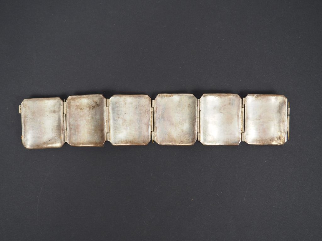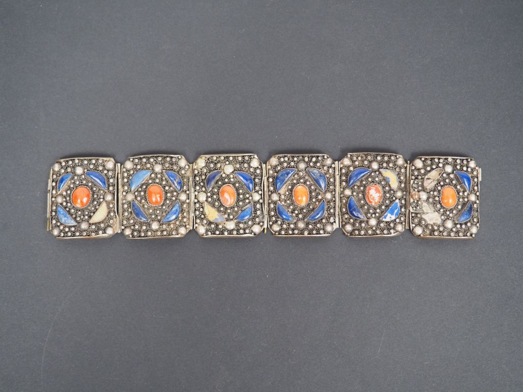 Bracelet en argent, cabochons de corail et lapiz lazzuli, décor perlé. Chine. L. 17,5 cm