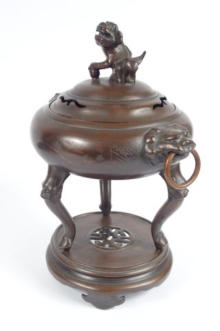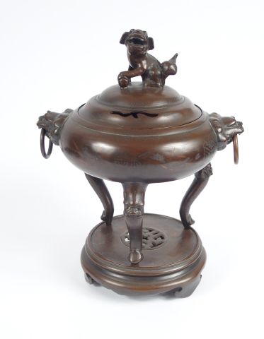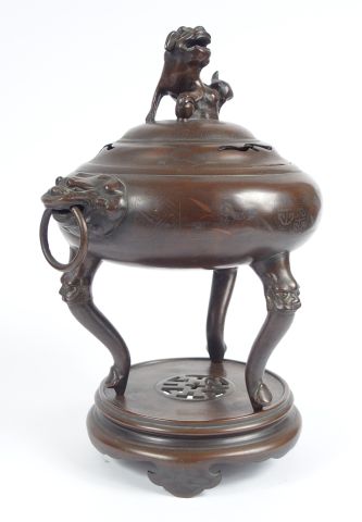 Brûle-parfum couvert, tripode, en bronze à patine clair, décor niellé de lotus et caligraphie, têtes de lion formant anses. Chine fin XIXème siècle. H. : 29,5 cm VENDU SUR FOLLE ENCHERE