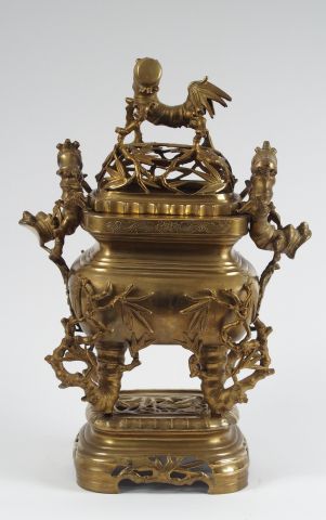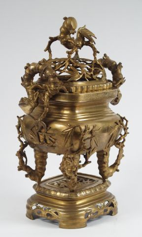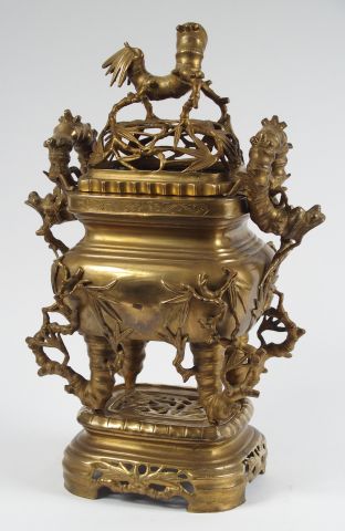 Brûle-parfum de forme quadrangulaire en bronze, orné de motifs de bambou finement ciselés en relief, prise ornée d'un lion stylisée. Indochine fin XIXème. H. : 52 cm