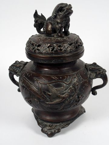 Brule parfum en bronze de patine brune, à décor en relief de dragons, les anses en forme de têtes de félin, la prise du couvercle représentant un shishi. Japon, fin XIXe siècle. H. 32 cm