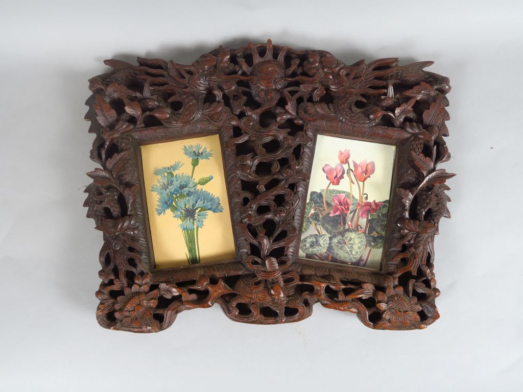 Cadre en bois naturel finement sculpté et ciselé de deux dragons affrontés parmi des feuillages. Indochine. 30 x 40 cm