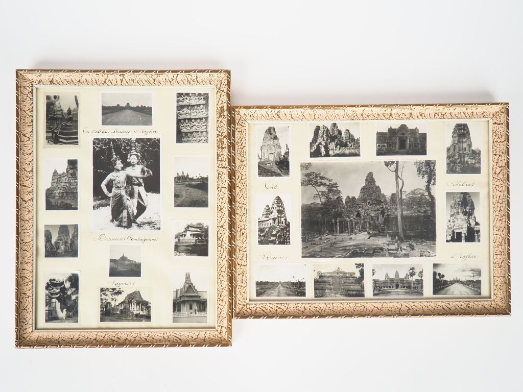 Cambodge, 1950, Deux cadres comprenant 23 photos en noir et blanc titrées "Les célèbres ruines d'Angkor", "Danseuses Cambodgiennes"et "Pagodes". Dim. des cadres : 38,5 x 28,5 cm Dimensions diverses pour les photos.