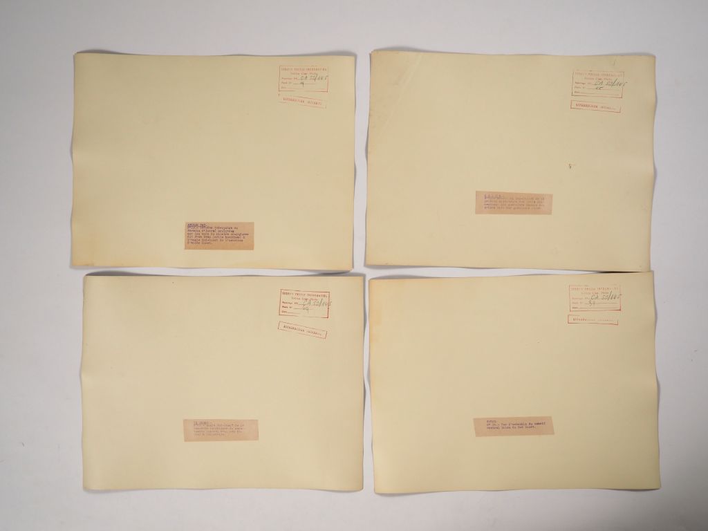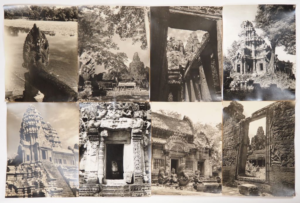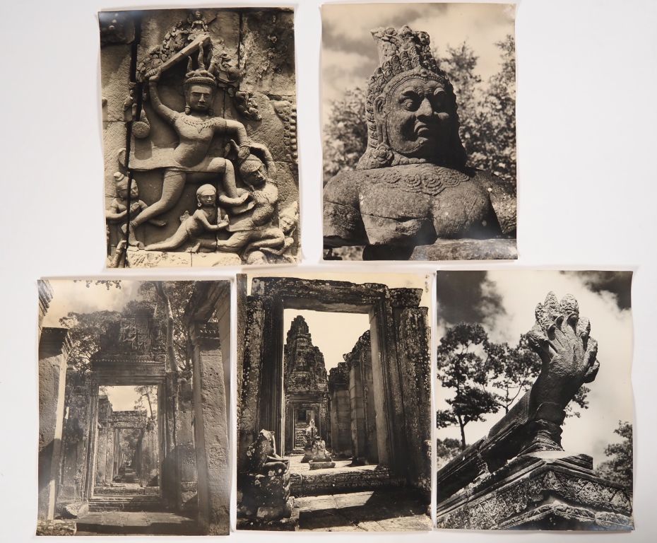 Cambodge, Lot comprenant trente photos en noir et blanc, légendées au dos, de temples, de sites et représentation de bouddha, dont d’Angkor Vat, Bayon, Ankor Thom, Banteay Srei, Chau Say Tevoda, Ta Prohm, étang du Srah Srang. Les photos portent un cachet au dos service presse information et sont numérotées. Usures, légèrement gondolées. Dim. 40 X 30 cm