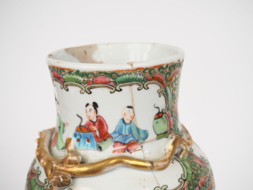 Canton, fin XIXe siècle, Deux vases de forme balustre, l’un à col ourlé pavillonné, en porcelaine et émaux de la famille rose à décor de scènes de palais, alternées d’oiseaux, papillons, fleurs et emblèmes bouddhiques. Un dragon salamandre en demi relief orne le col de l’un, quatre dragons salamandres en demi relief et deux lions bouddhiques en relief sur le pourtour du col de l’autre. Restauration, accidents. H. 29,5 cm H. 25,5 cm