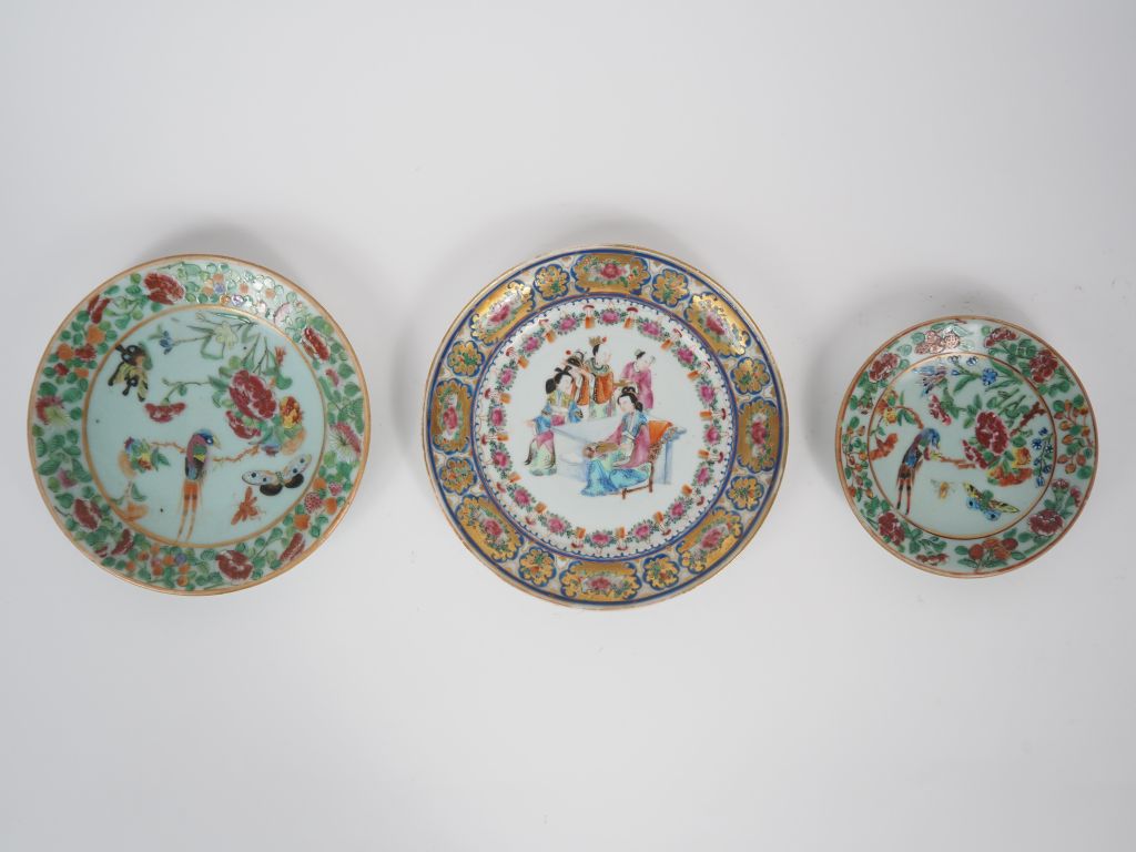 Canton, fin XIXe siècle, Trois coupes en porcelaine et émaux de style famille rose, à décor de jeunes femmes, oiseaux, papillons et fleurs. Diam. 14,5 à 20,5 cm (égrenure)