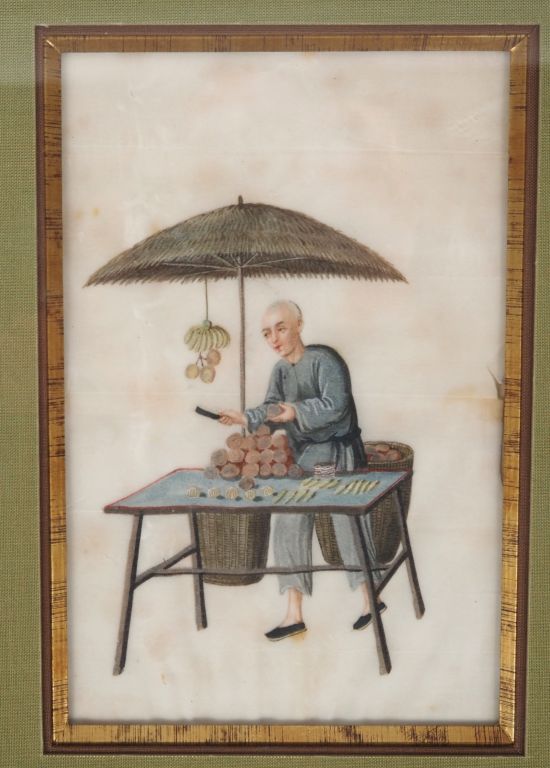 Canton, fin XIXe siècle, Trois gouaches sur papier de riz représentant métier, scène de jugement…. Mauvais état pour deux. Dim. 18 x 12 cm et 19 x 26 cm