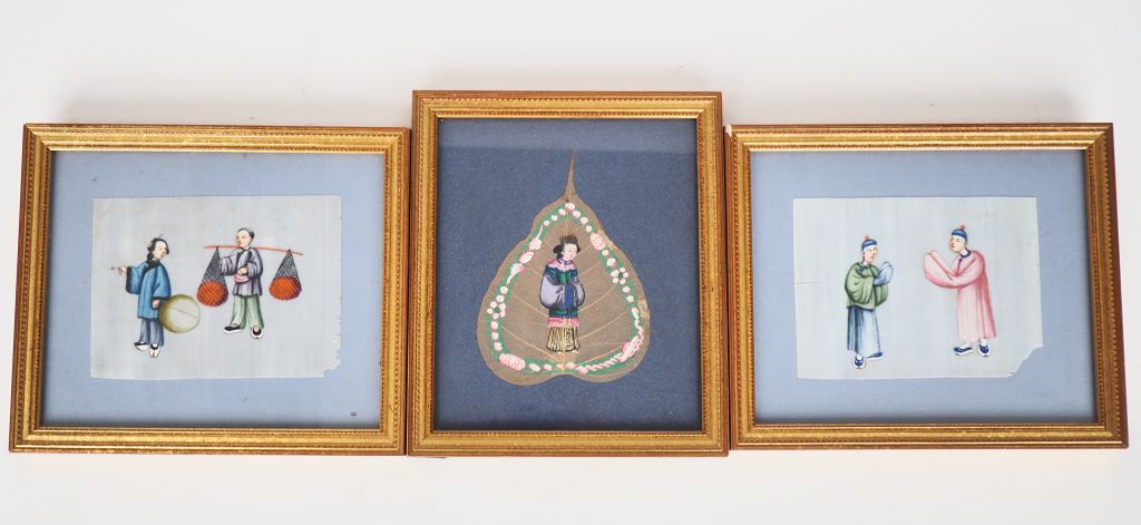 Canton fin XIXème. 3 différentes gouaches à décor de personnages. Dim. 10,5 x 14,5 Dim. 13,5 x 14 cm. (Manques).