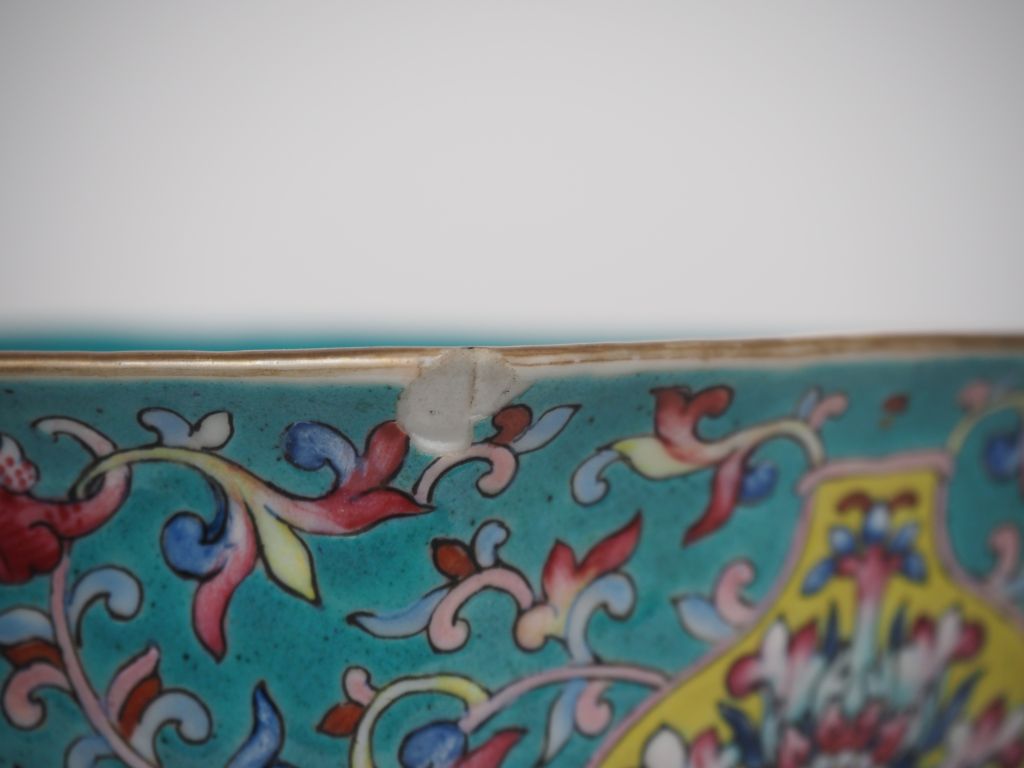 Chine, 2ème moitié du XIXe siècle Coupe hexagonale sur piédouche, finement décorée en émaux de la famille rose sur fond bleu turquoise de chauve-souris, fleurs de lotus, caractères fu et tiges feuillagées. Marque en zhuanshu sur la base. Diam. 19 cm (Eclat)