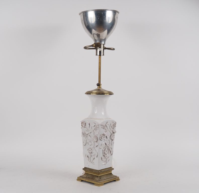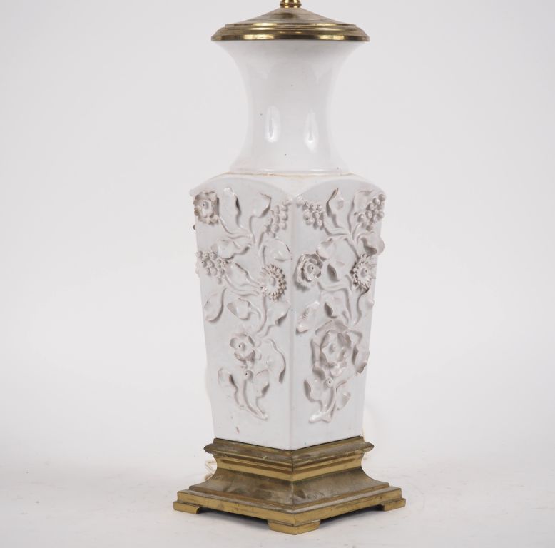 Chine, 2ème moitié du XXe siècle Vase quadrangulaire en porcelaine blanc de Chine, à décor en léger relief de chrysanthèmes, pivoines. H. 36 cm (Fond percé)