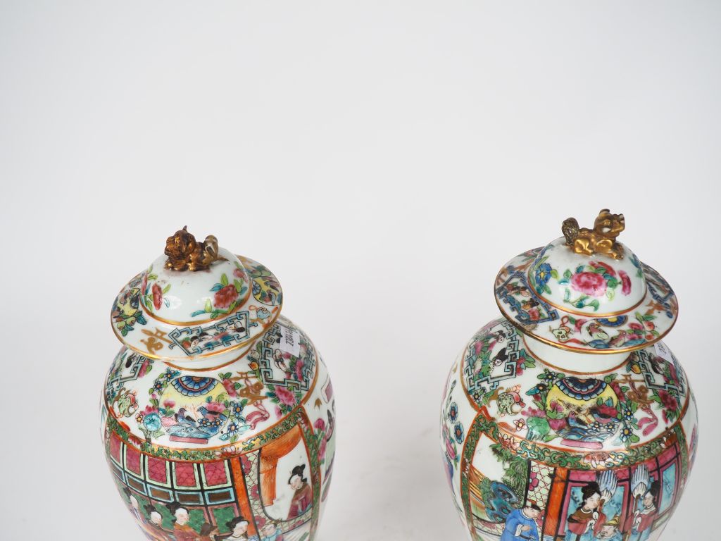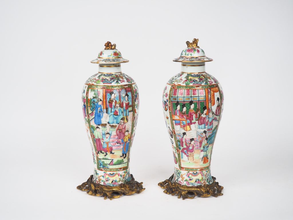 Chine, Canton fin XIXe siècle, Paire de vases couverts de forme lancelle en porcelaine et émaux de Canton sur des montures en bronze postérieurs de forme rocaille. La prise du couvercle surmontée de lions bouddhiques à décor d’objets mobiliers et personnages. (un couvercle restauré). H. 35 cm