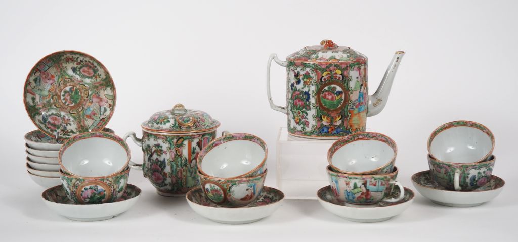 Chine, Canton, vers 1880-1900 Service en porcelaine comprenant, une théière, un pot à sucre, huit tasses et onze sous-tasses, à décor de palais animés de personnages, oiseaux, fleurs et végétaux. Dim. 17 – 16 – 12,5 cm