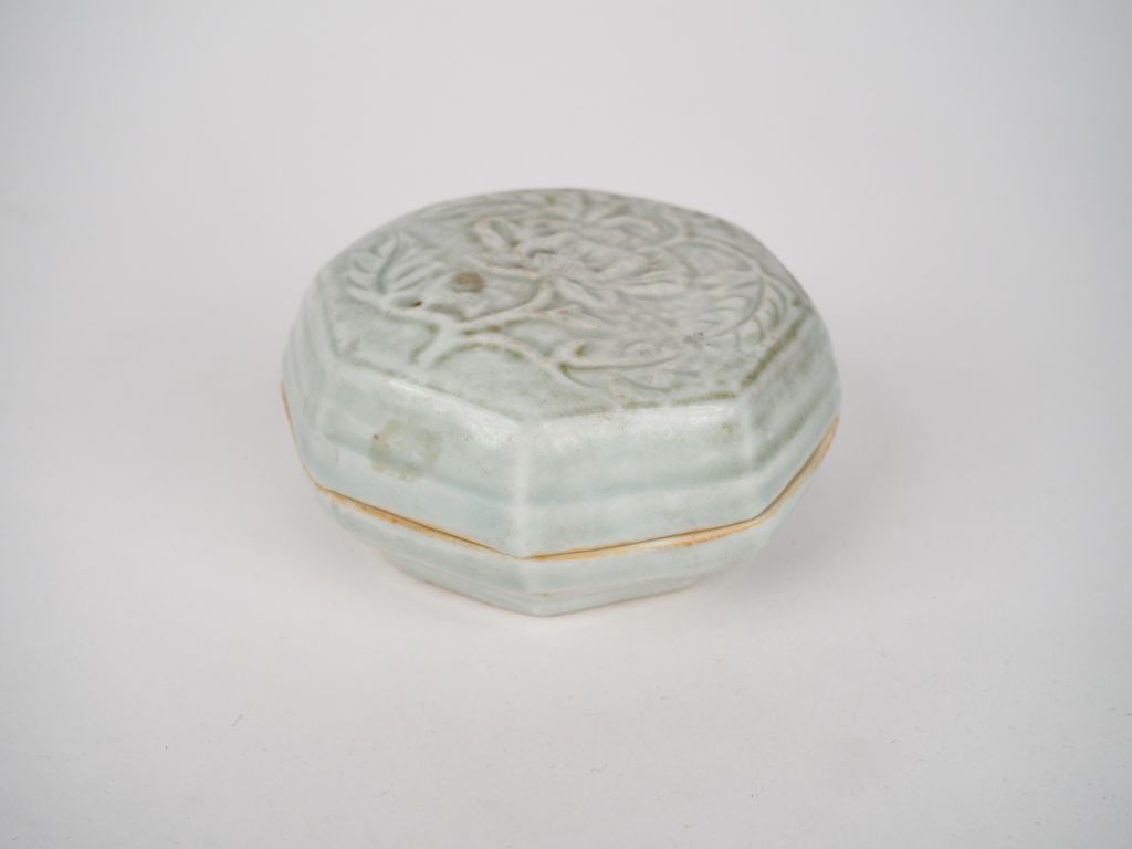 Chine, dans le style des Song. Boîte couverte à épices, de forme octogonale, en porcelaine qingbai, le couvercle orné d’une fleur de pivoine, ouvrant sur une branche à trois tiges cloisonnant trois petites coupes. Dim. 5 x 10 x 10 cm