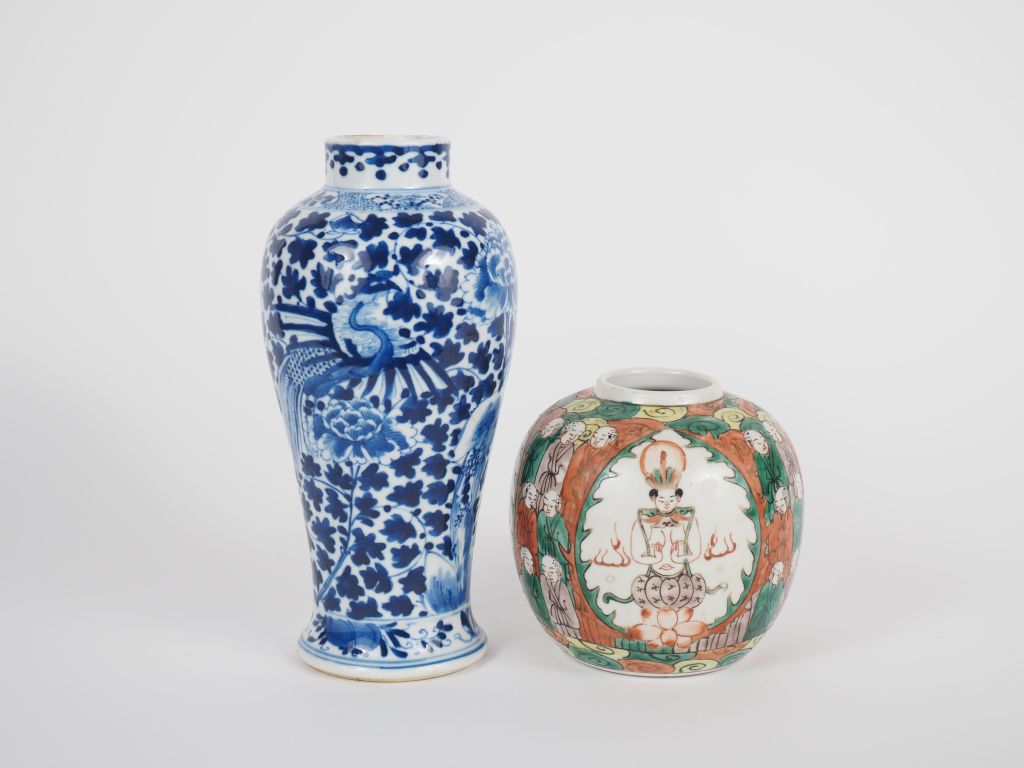 Chine, début XXe siècle Lot comprenant un vase balustre bleu blanc, à décor d’un oiseau paradis évoluant parmi des pivoines en fleurs (fels) , et un pot globulaire en porcelaine et émaux de style famille verte, orné de bouddhas et lohans, avec marque apocryphe Kangxi. H. 22,5 et 13 cm