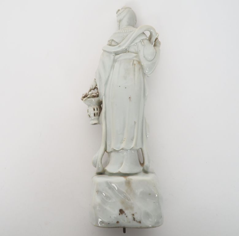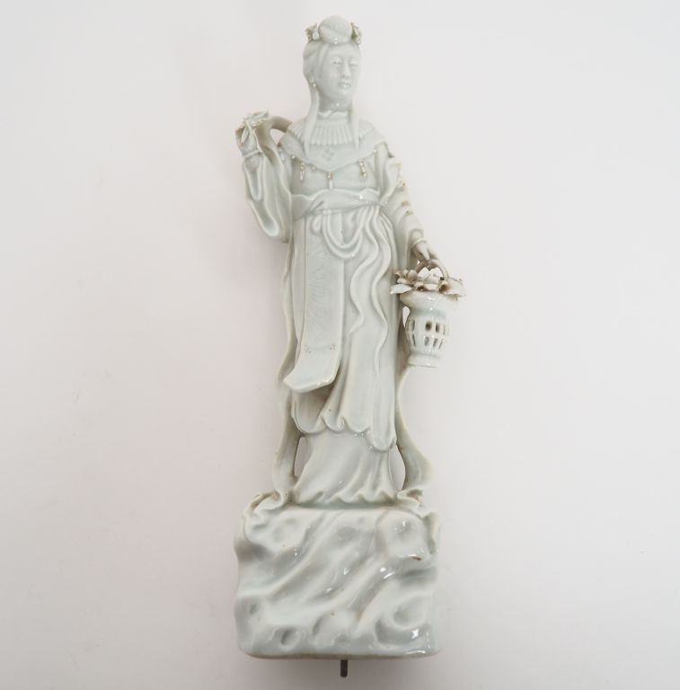 Chine, deuxième moitié du XXème siècle, Guanyin en porcelaine blanc de chine, représentant une déesse du printemps représentant un panier de fleurs. H. 24,5 cm
