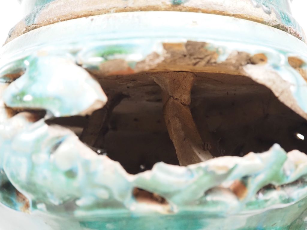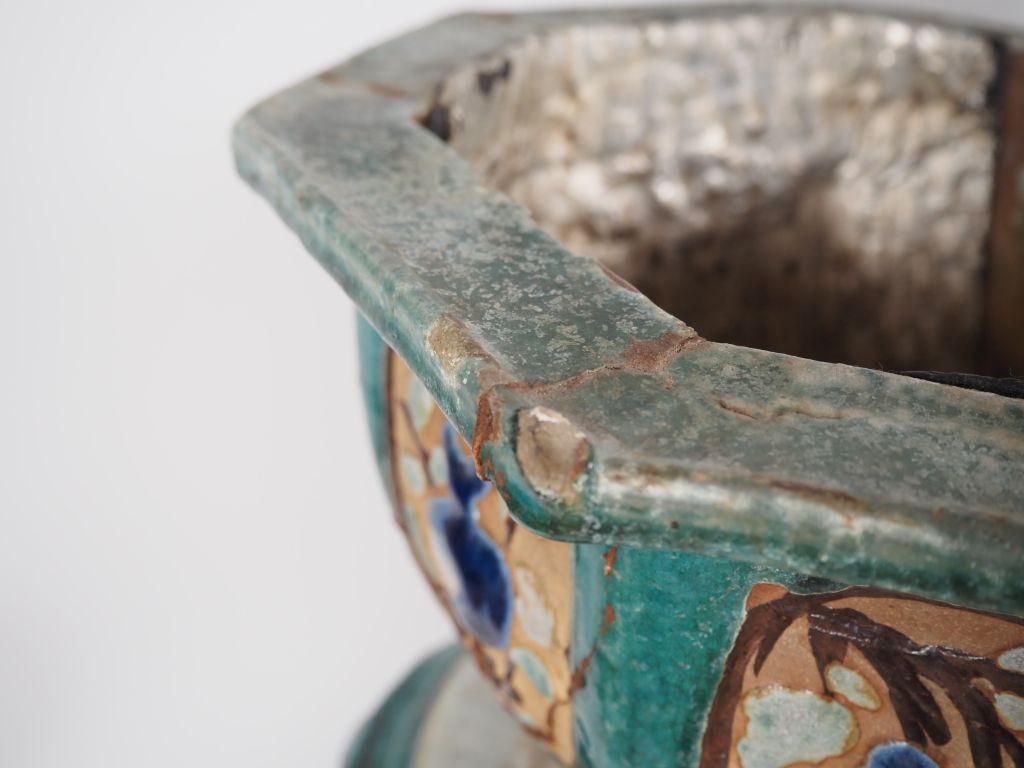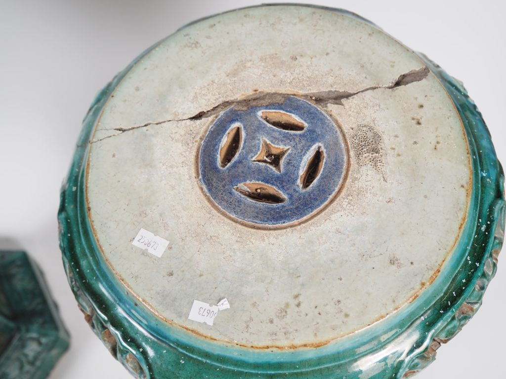 Chine du Sud, Vietnam, fin XIXe début XXe siècle, Deux sellettes en céramique émaillée verte à décor ajouré de feuillages, supportant deux grandes jardinières, de forme octogonale, en céramique émaillée vert, brun et bleu à décor de grandes et courges… Accidents et restaurations. H. sellette 67 cm