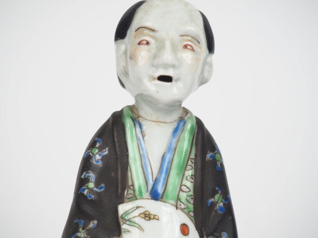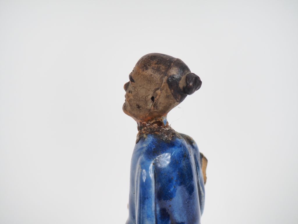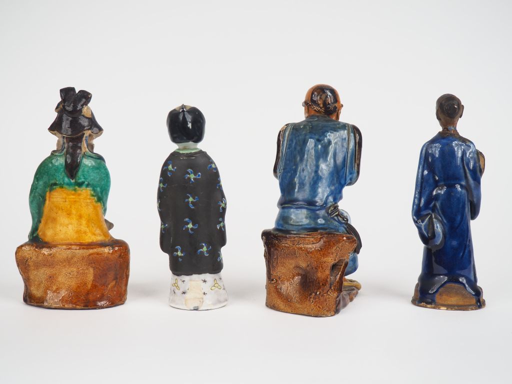 Chine du Sud, Vietnam, Japon Ensemble comprenant quatre statuettes en terre cuite vernissée, dont une féminine et trois masculines. H.16 à 17 cm