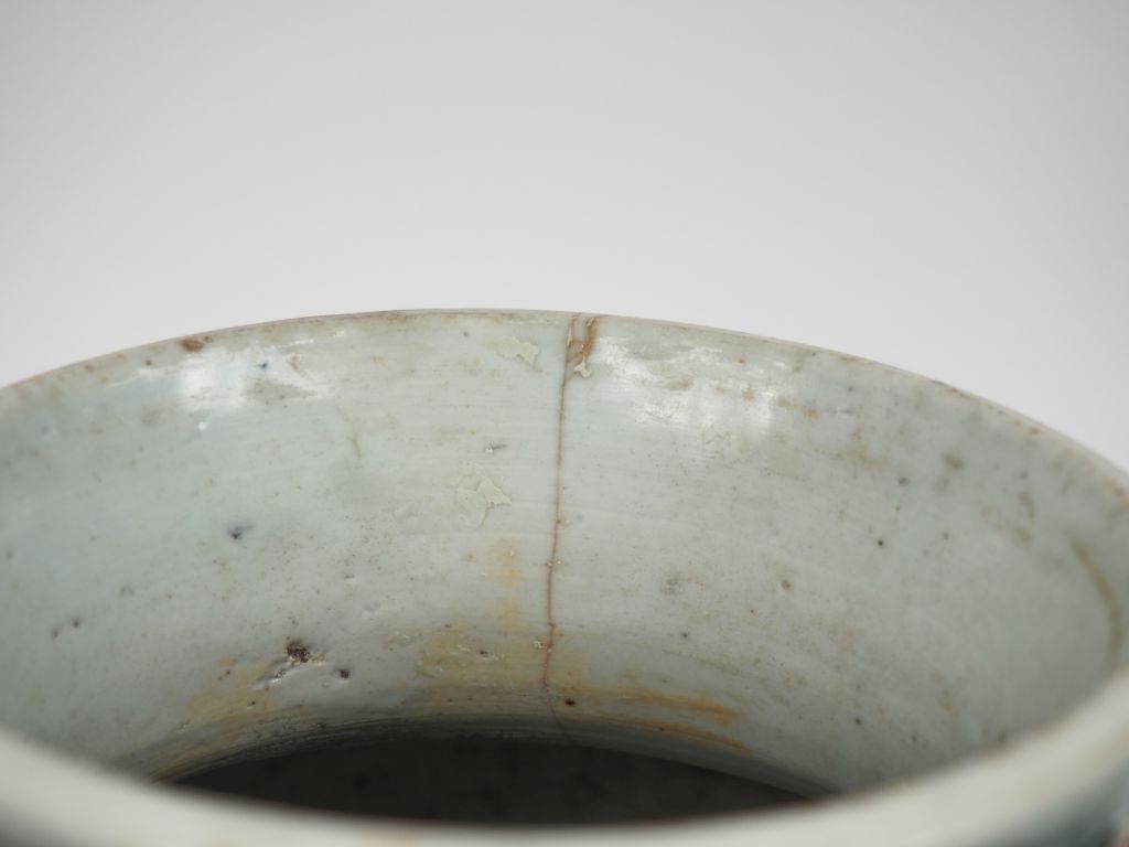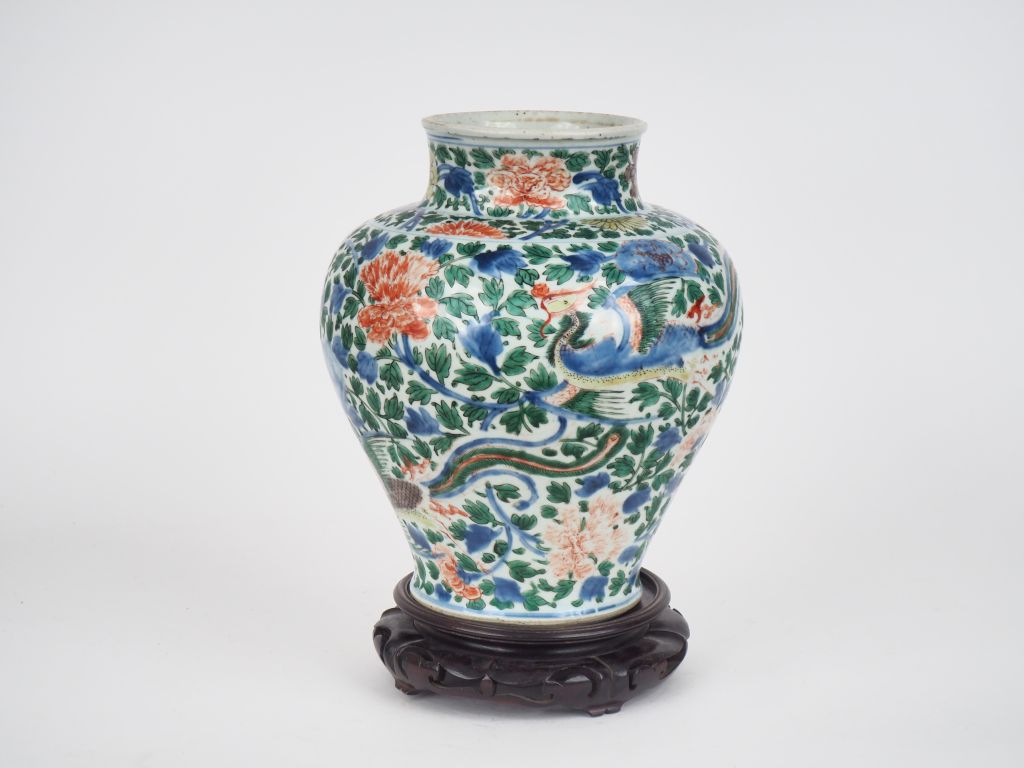 Chine, époque Kangxi Vase balustre en porcelaine et émaux de la famille verte à décor de phénix parmi pivoines éclatées et rinceaux feuillagés. H. 30 cm Fels et restauration